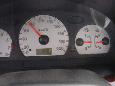 很快,我們又經(jīng)過(guò)了900公里的里程牌,我和老婆的手也緊緊的握到了一起,沖!最后的100公里是那樣的漫長(zhǎng),腳已經(jīng)很疼很麻木了,但仍舊要牢牢的控制時(shí)速在80公里,在最后的階段這樣顯得尤為重要,時(shí)速表牢牢的指在80公里的位置,除了上下坡,上下差幅小于3公里。不知不覺(jué),我和老婆緊握的手已經(jīng)被汗?jié)裢噶耍覀兌荚跒樽约海瑸樾●R捏著一把汗。前方的路好象永遠(yuǎn)也走不到頭,燃油報(bào)警等依舊那么刺眼的亮著,眼看著里程表一點(diǎn)一點(diǎn)的走字,950、960、970、980…… 終于,馬上就要接近1000公里了,我們臉上都露出了喜悅的表情,到了,馬上就要到了,但同時(shí)我們也都擔(dān)心不知道小馬還能否堅(jiān)持走完這最后的十幾公里。終于,近了,近了,998、999、1000!!