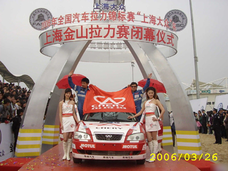 在2006中國汽車拉力錦標賽S組中,一組紅白相間的賽車特別引人注意,他們就是首次代表奇瑞汽車參加全國汽車拉力錦標賽的奇瑞飛騰車隊。這支車隊有著謝春旭、吳壯、蔡顯中等國內非常優秀的賽車選手,車隊從去年開始完全使用民族品牌奇瑞旗云作為自己的專用賽車。在這個合資品牌汽車占主導地位的拉力賽中,這支車隊代表的是民族汽車的力量。奇瑞作為民族汽車品牌的代表,將自己的車作為賽車參加如此高水平的國際級別賽事,是民族汽車發展的一個飛躍,也是奇瑞汽車進一步加強與國際的、合資的品牌爭奪市場的表現。