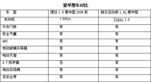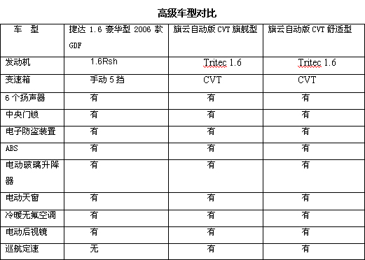 我們列出一些簡單的配置可以看出同類型同配置旗云在動力、節油更有優勢,不但在每款待車型上都能保持著與捷達3-5萬的價格差優勢,同時也在高低兩端形成了對捷達整體產品線的包夾,捷達的日子將不好過了 。