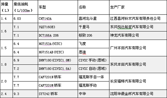 轎車產品油耗測試結果如下(1.4L 1.6L 1.8L 2.0L 2.4L油耗最低產品):