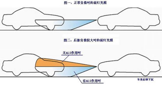 如果說AFS控制的是燈光的"左右"調(diào)整,那么ALS控制的則是燈光的"上下"調(diào)整。通常,汽車大燈的光軸與車身水平線保持一致。如果后排負(fù)載較大,車身水平線難免會出現(xiàn)上揚(yáng),因此大燈的光軸也隨之上揚(yáng),會對對面車輛的駕者產(chǎn)生干擾。一般駕者都會對此深惡痛絕,實際上,這也正是導(dǎo)致許多車禍發(fā)生的原因。ALS在后排負(fù)載較重導(dǎo)致車身角度上揚(yáng)時,可自動調(diào)整光軸傾角,保持光軸水平,避免光軸上揚(yáng)對對面來車駕駛?cè)藛T的干擾。
