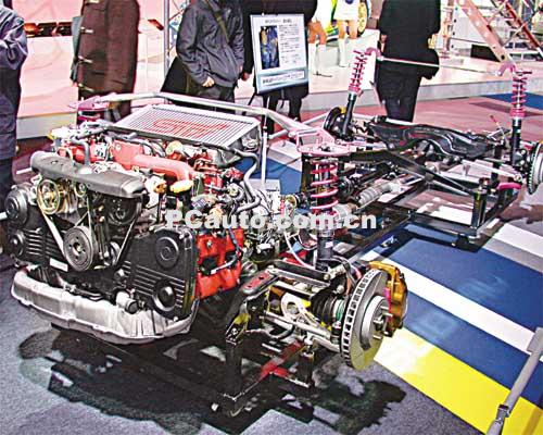 廠方特意展示的WRX車架和引擎,讓車迷一目了然