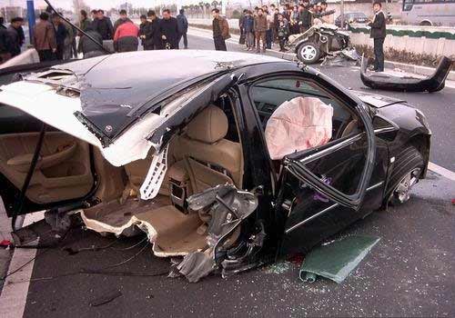根據《質量鑒定報告》中分析:司機為了避讓,在車速約達112KM/h時急打了方向盤,造成車輛側滑,當事車向左前呈弧形回旋(側滑)運動約36米,左前輪先與道路中央的綠化隔離帶的水泥護板相撞并彈起,隨后右前輪也與道路中央的綠化隔離帶的水泥護板相撞并彈起,緊跟著左、右前輪越過綠化隔離帶,整個車身橫過來幾乎與原行駛方向成直角,繼續向前側滑約10米后,以83.4KM/h速度側撞向剛性隔離墻,即車右后門位置與剛性隔離墻端面猛烈碰撞,在撞擊力與反作用力的作用下造成車身斷裂,同時,前半個車身砸向對面車道地面,后半個車身在反作用力的作用下也被甩到對面車道的另一側,釀成一起3死2傷的重大交通事故。