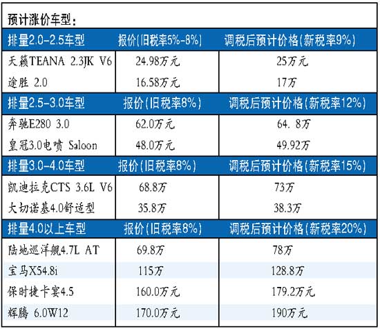 業(yè)內(nèi)專家預(yù)測,此次調(diào)稅對價格影響最大的會是豪華進(jìn)口車,按照規(guī)定,2.0升以上大排量汽車的稅率與以前相比將有1%-12%不等的上漲幅度,進(jìn)口大排量車的成本相應(yīng)增長,由于市場占有率低,上漲價格估計在幾萬元到幾十萬元不等。以一輛進(jìn)口的4.2升SUV車型為例,相比原來5%的稅率,僅消費稅一項就有15%的增幅,如此大的增幅是廠家無法承擔(dān)的,勢必在終端銷售上對定價做出調(diào)整。