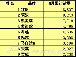 總體來說,8月份的車型銷量比7月份有所放大,從中可以隱約感覺到車市淡季即將結束的信號。9月、10月是傳統的銷售旺季,車市能否如期轉暖,我們拭目以待。