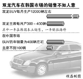 其實(shí),雙龍?jiān)陧n國(guó)市場(chǎng)的銷(xiāo)售并不盡如人意。“雙龍SUV的產(chǎn)量是每月12000輛左右,雙龍主席的產(chǎn)量為每月300~400輛,其中一半在韓國(guó)本土銷(xiāo)售,一半銷(xiāo)往海外,在中國(guó)市場(chǎng)一年的銷(xiāo)量為SUV400輛左右,主席100輛不到。”韓國(guó)雙龍一位駐華代表告訴《每日經(jīng)濟(jì)新聞》。