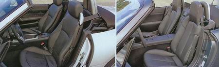 令人驚訝的是,MX-5在障礙跑道舒適度測試中層現出了完全令人信服的表現。不管是地面起伏不平,橫向地面裂縫,還是路面坑洼——看看這輛外形簡潔的日本車是如何從容應·付道路表面的缺陷的,那實在是令人嘖嘖稱嘆。而寶馬車的表現就不是那么應對自如了,盡管整車的上下顛簸起伏較小,但是在通過橫向路槽的時候,后橋所承受的狠狠的撞擊感尤其強烈,硬硬的感覺讓人很不舒服。 對于雙座敞篷車來說,背景噪聲是一個重要的因素。Z4汽車的車內噪聲即使是在很高的速度時也相對平靜,而坐在馬自達車,聽上去就仿佛是在刮一場小小的颶風。其實,MX-5的車身敲起來也會發出鐵皮般的聲音——其德國對手車所多出來的176kg(總重量1312kg),看來在很大一部分程度上提高了車體的抗擊剛度。這樣,寶馬在駕駛舒適性方面也贏了這個回合。