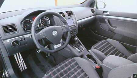 和GTI發動機配合的是大眾奧迪的DSG變速箱。該變速箱采用兩個獨立的離合器,在電腦的控制下自動咬合及分離,所以不需要離合器踏板。換檔的速度非常快,但和寶馬的SMG序列式手動變速箱不同,該變速系統工作時幾乎是無痕轉換,依靠兩個離合器的完美配合,感覺不到換檔的發生。你可以將它作為普通的自動變速箱使用,也可以利用方向盤后的撥桿來換檔。降檔時只有關注轉速表,才能發現檔位的變化。美規GTI的加速略慢于歐規車,原因是前者的DSG計算機系統中缺少起步控制程序。歐規GTI允許離合器咬合前讓發動機提高轉速,并有效地控制車輪空轉,而我們的美國版測試車則沒有該功能。大眾公司告訴我們,從明年起兩種版本皆有起步控制系統。雖然我們都偏好使用傳統的離合器和變速箱,但DSG的出色工作不得不讓人刮目相看。