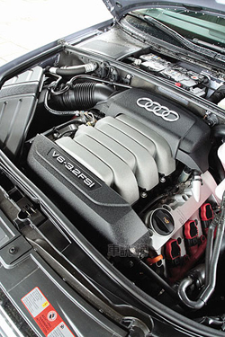 這具3.2升V6引擎為全新型號,看起來雖與先前的3.0升引擎非常相像,但排氣量已擴至3.2升并采用最新的FSI缸內直噴系統,氣門結構則從每缸五氣門改為四氣門設計,并附上雙可變氣門正時及三段變化的進氣歧管。就V6引擎的標準來看,這具3.2升引擎長度僅360mm、寬度430mm,且本體重量僅169.5kg,可列入輕量級制品,并能將前輪重量負荷減至最低程度。功率輸出方面,其255匹最大馬力在6500rpm可完全爆發,33.8kgm的最大扭力則在3250rpm涌現,且因可變氣門正時及三段可變進氣歧管對進氣時間與流量的精準控制,讓這具引擎在1900~5900rpm間可隨時提供90%的最大扭力。也就是說,這具引擎在任何時刻踩下油門至少都能供應30.5kgm以上的扭力,非常突出。