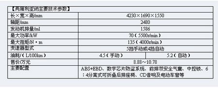 兩廂利亞納的配置基本與三廂版相同,如高度可調的駕駛座椅、鋁合金輪圈、ABS+EBD、數字芯片防盜及前排雙安全氣囊等配置都力求實用,并不花哨。使用起來也比較省心,尤其是電動車窗和帶6揚聲器的CD音響,還能讓你在朋友面前贏得更多的面子。而自動恒溫空調和真皮座椅在同價位車型中比較罕見。具有一定性價比的優勢。