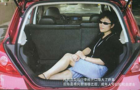 騏達的后排座椅同樣可以4/6分折,而且還可以選裝可前后滑移的后排座椅。記者以裝備了可謂移后排座椅的騏達為例,如果把座椅折疊。然后再往前滑移,行李艙的空間一下就可以在原有289L基礎上迅速增至463L。即使只是把座椅向前滑移,也可以獲得非常大的行李空間。記者在試駕過程中曾經嘗試著要坐進三廂頤達的行李艙來進行公路上的追拍。拍攝兩廂騏達的動感圖片,但是由于頤達的行李艙開啟高度不夠,記者沒有能夠坐進去。而騏達則恰恰相反。在把座椅向前滑移之后記者就可輕松坐在里面。而這種可前后移動的后排座椅更成為國內兩廂車在空間利用率方面的開山之作,后部空間擁有100%的自由度,在滿足最大后排舒適度的同時也創造出了最大的貨載空間。