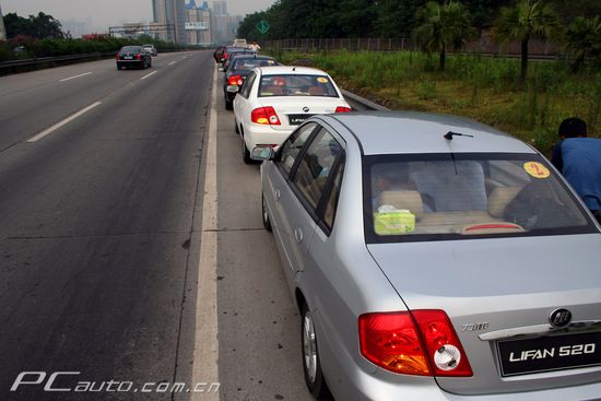 7臺(tái)力帆520新車在內(nèi)環(huán)高速公路邊整裝待發(fā)