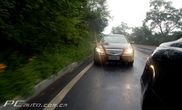 隨著地勢的逐漸升高,霧氣也越來越濃,逐漸演變成彌漫的毛毛細雨。自動感應雨刷在不經意間自動開啟,盡管我們的視線還并不算模糊。地面開始變的濕滑,后車大燈的反光已經清晰的映射在瀝青道路上。不過我們并沒有減速,大家似乎都刻意想去試探SH-AWD的極限功效。筆者整個人鉆出天窗外進行拍攝,已經被連續的手肘彎晃的東倒西歪,又是風又是雨簡直痛苦不堪,而車內的同伴卻興奮的呼喚著:我還能更快一些。顯然,SH-AWD多少發揮了應有的作用,一些都在掌控之中,給予了我們充分的信心,離失控的警戒線還遠著呢。