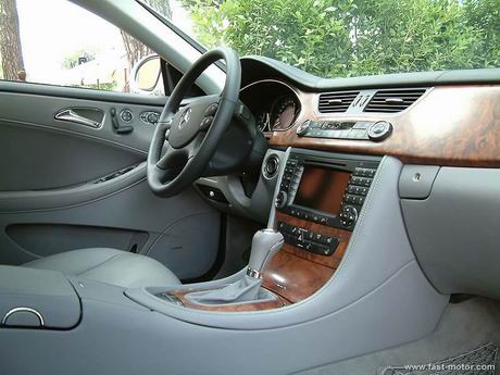 除了不同的外觀以及全面的感覺,CLS的其它部位還是完全的奔馳感覺。門可能小了一些,但是仍然有關門時的砰砰聲。車內部感覺十分堅固,和外部的嘈雜完全隔絕,低速行駛的時候非常安靜,強勁的302馬力V8發動機讓人感覺是在車后部運轉。大部分的開關設備和測量表都于E系標準一樣,只是整齊的重新安置在新的儀表板上,而且和往常一樣非常容易操作。新一代的COMAND導航系統是建立在DVD基礎上的,反應速度很快,操作界面也比以前更加友善,盡管有許多按鈕在上面,它的一鍵操作系統還是能夠輕松掌握的。和以往的風格一樣,這部車的電子系統的整體性還是非常好的,比如說:你只要把手機接駁在扶手里的專門插座上就可以進入手機里的地址簿,通過COMAND系統和方向盤上的控制按鈕把地址簿里的信息顯示在里程表中央。