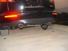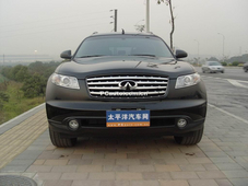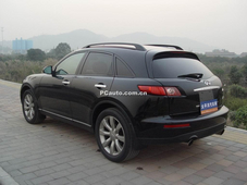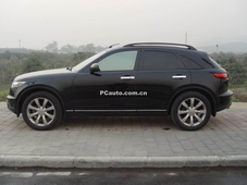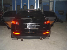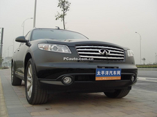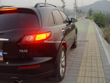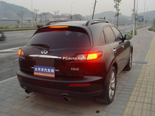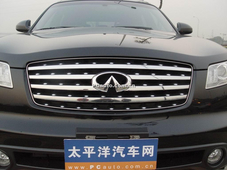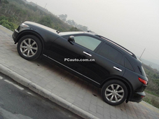 無限的外觀一看上去就叫人興奮:全黑的車身,前臉看上去十分的有攻擊性,傳統的Infiniti寬大的格柵、標準霧燈、扁平的斜四方行氙氣前燈是點睛之作,給人一種勢不可擋的霸氣感覺,大大的廠徽鑲在中間,告訴你我是品質與信心的保證。側身望去像極了充滿肌肉的猛男,20吋巨型輪圈襯托下,粗獷的風味不言而喻,一付蓄勢待發的模樣就呈現在眼前了,斜向車頭方向的C柱,不僅為FX的流線造型加分,也增添了些許兇悍的架勢。后車窗的玻璃則采用了現在許多SUV車款常用的暗色處理,車尾部分則和車身曲線一樣、充滿了圓滑的肌肉感,并且沿著尾窗周圍,尾燈組也和頭燈一樣、都是細長狀的造型,也一樣入侵到后葉子板的位置,直截了當地和車頭燈來個前后呼應,尾部還有兩個單獨、巨大的鉻排氣管讓你感覺到它濃重的跑味。
