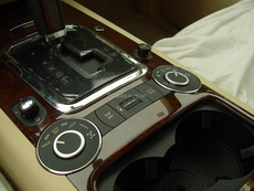 再看看檔桿后面的兩個旋鈕開關(guān)和一個控制器,左邊的旋鈕調(diào)節(jié)越野減速器和分動箱:公路選“高”,越野選“低”。右邊的旋鈕用來控制車身的高度(在四門同時關(guān)閉情況下,車頭和車尾交換式上升和下降,在行駛途中同樣可以進行升降),中間的控制器可以有三種方式選擇:運動型、舒適型、自動型。