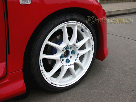 對于這樣外拋的包圍,輪圈的搭配相當重要,搭配17寸輪圈則能達到上佳的視覺效果,若搭配15寸輪圈則全無FIT DYNAMITE應有的氣勢。該車搭配了17寸的日本WORK EMOTION系列輪圈,盡管該款式的輪圈在日本已經推出多年,但至今在各大比賽和街道上仍有相當高的曝光率。由于使用了17寸的大直徑輪圈,所以輪胎使用了205/40R17的這一尺寸,這樣的輪胎與輪圈搭配出來的外觀效果一流,而且彎道上輪胎壁的變形也相當小,對彎路的操控有不小的幫助;但如此扁平的車胎在坑洼的路面上行駛則要更為留心。