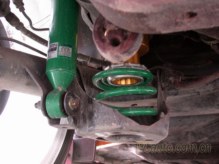 懸掛方面選擇了TEIN的SUPER WAGON系列攪牙減震,除了可隨意調節車身高度外,還能進行16段的軟硬調節,以滿足不同場地的需求。整體來說這套減震能提供不俗的支撐力,令人最欣賞的是它在鋪裝較差的路段依然有上佳的吸震力,保持了一定的舒適性,不會有一般攪牙減震過分的彈跳感。一般的SUPER WAGON系列減震只能停車以后在減震塔頂上對懸掛的軟硬進行調教,但這臺飛度還裝上了TEIN的附加設備EDFC,它在減震塔頂上安裝了小型的電機,可以通過在駕駛室內的液晶控制器對電機進行控制,從而達到行駛中隨意調節減震軟硬的功能。