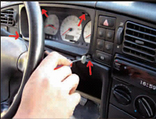 2.準(zhǔn)備工作好了,開始拆卸儀表盤了,先把圖中儀表的四顆螺絲拆掉(圖中紅色箭頭指的四顆螺絲),把拆卸下來的螺絲都放到小盒中,防止丟失。