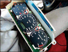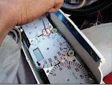 8.拆下老表盤后開始擰背光板的固定螺絲。剛才固定儀表鋁片六顆螺絲其實可以不用都上,3-4顆就夠了。因為這次的表盤由3個變成一個連體的了(如果您堅持要都上,也無所謂)。捷達的儀表有好幾批,螺絲的孔距略有些差別,在1毫米左右,如果背光板上的孔位置不合適,用鉆頭和小刀輕輕擴個一兩毫米左右沒問題,不會傷到背光板電路的。注意螺絲別上緊,上到頭后需要回轉半圈到一圈。