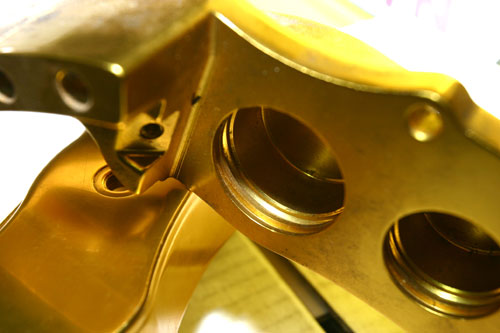 其次是煞車卡鉗轉(zhuǎn)接座的制作精度,尺寸、角度精確的轉(zhuǎn)接座應(yīng)當(dāng)讓分泵與碟盤完全平行,這樣分泵推動煞車皮時才能無角度偏差的施力于碟盤,作用間隙減少有利于行程的控制,如此才能擁有好的腳感。