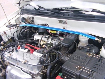 在發動機倉內,我還看到了平衡桿,或者有個更準確的學名“車輛前避震頂端拉桿”。動力強了,按我朋友的習慣不免會去飚車,眾所周知,汽車在高速行駛時,可能會發生車身的輕微變形,所以在菱帥的兩個減震器之間裝上平衡桿的話,可以增加前部車廂的鋼性,改善車輛在彎道行駛中的穩定性和平衡性,最終提高了行車安全。改車的人往往會忽略這一點,我的朋友就考慮到了,而且他選擇了鋁合金的平衡桿,可以保證長期不易變形。 (圖片點擊可以放大)