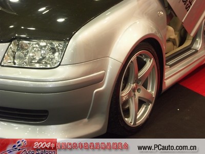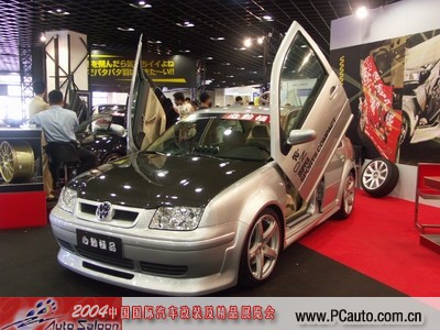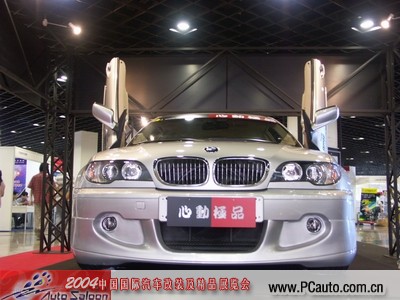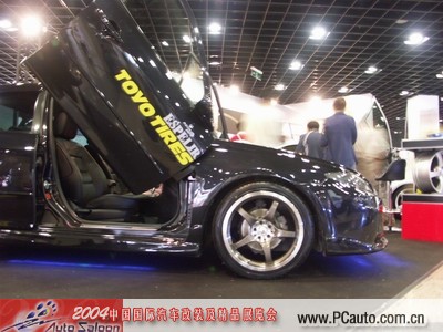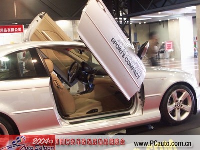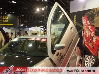 一進入展廳最吸引人的就是展臺展示的上海心動改裝的幾臺樣本車,最讓人激動的是常常在東京改裝車展等展會中看到的鷗翼式車門改裝出現在了此次展會中,而心動改裝店此次也是在展會開幕前趕工完成的,三臺樣車為BMW330Ci、一汽馬自達6、一汽大眾寶來。涉及到的車型一些是國內改裝車發燒友非常喜歡的車型,除了鷗翼式車門以外,寶馬330Ci動了進排氣、燃油系以及本身的一些底盤裝飾燈光,就突破而言,一進展廳的觀眾一定會被吸引,不過現場的車建議大家在欣賞的同時還是不要多開關車門為好,鷗翼式的車門開關比較特殊,有一拉一推的前奏,如果相象與普通的車門那樣開關就難免出現沒法如愿,所以很多朋友在開關的時候出現了不知道如何用力的現象,反而會影響車輛展出,建議大家多欣賞這國內率先“飛”起來的改裝項目,至于這其中用的碳纖維頭蓋、大包圍、O.Z的輪轂、比賽用扁胎以及內艙中用的DEFI表、燃油控制器等等也希望大家細細品味,那些都是改裝件中的豪華配置,價值不霏,也代表了動力部份的可見改裝程度。