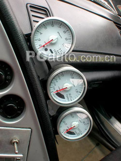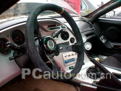 內飾部份 駕駛室內最顯眼的莫過于那張紅色的下場版SPARCO不可調座椅。車主在采訪的時候相當強調玩車的安全性。對于他那爆改的引擎,他并沒有過多地介紹,反而在駕駛室的介紹方面則相當重視,他不止一次地強調“安全”這兩個字。而在它的這臺愛車上裝備了FIA認可的防滾架,4點式安全帶,還有專用的滅火器。駕駛臺連音響系統也被拆除了,換裝上的是TURBO TIMER和各類引擎輸出的調整開關。還有3個醒目的日本DEFI儀表做引擎狀況監控,對于高熱高壓的TURBO車來說,這樣的監控儀表是必不可少的。 (圖片可點擊放大) 駕駛室以及大凹的改裝方向盤  |  | | DEFI儀表的中控器 | 美版SUPRA的儀表 |