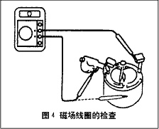 用電阻表如圖4所示,一表筆接磁場線圈的正極引線,另一表筆接正極電刷,電阻值應為0。如果電阻值為∞,表明磁場線圈斷路。此時將其中 的一只表筆與外殼接觸,其電阻值應為∞,否則說明線圈與外殼有搭鐵部位。