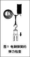 (1)檢查電刷彈簧有無變形、折斷等,如有應予更換。彈力檢查可如圖5所示用彈簧秤檢查,其壓緊力應符合13.7~19.6N的規定。否則應更換電刷彈簧。