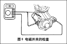 如圖8所示,只需將接C端子的表筆移至電磁開關外殼即可,此時,電阻值也應為0。如果電阻值為∞,說明保持線圈有斷路,應予檢修或更換電磁開關。