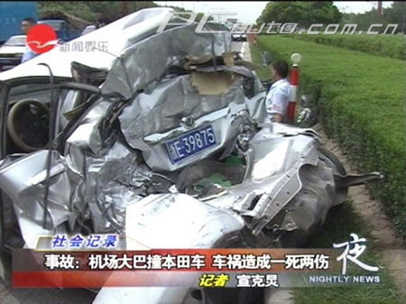 2005年7月20日,在上海浦東發(fā)生了一起惡性追尾事故,一輛機(jī)場(chǎng)大巴由于操作失誤竟然把一輛路上的廣州本田飛度三廂轎車撞凹了進(jìn)去了,事故造成一死兩傷。坐在飛度后排的乘客不幸在車禍中喪生。