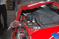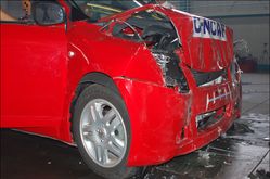 雨燕在本月19日進行的首天試驗是正面100%重疊剛性壁障碰撞試驗。在試驗中,一輛紅色雨燕以50Km/h的時速全寬度正面沖擊剛性壁障(此剛性壁障屬于不吸能物體,墻壁由鋼筋混凝土制成,表面覆有20mm厚膠合板)。撞擊的一瞬,雨燕前排的兩個安全氣囊順勢打開。需要指出,同樣作為A0級轎車,雨燕的副駕駛氣囊對于車內乘員的充分保護是上一期的主角——雅紳特所不具備的,值得肯定。除此以外,安全帶預緊裝置也是雨燕的安全標配之一。為什么要在這里重點提及雨燕的這兩項安全配置呢?在以前的文章中我們介紹過,正面100%重疊剛性壁障碰撞試驗雖然在強度和對車體結構沖擊方面不及40%偏置碰撞,但對于約束系統確是個嚴峻的考驗。 |