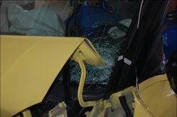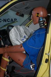 隨著劇烈的撞擊結束,整車質量剛過1噸的雨燕向右后方倒退了數米,此時車體幾乎與先前的行駛方向呈垂直狀。車輛的前保險杠仍舊沒有脫落(可能是沒有設計行人保護功能),翼子板發生褶皺,但這次沒有影響到左側駕駛員車門的開閉。需要特別提及的是,撞擊后發動機蓋箱按設計向上隆起,擔左側的邊角已經插入恰擋風玻璃,令后者破碎。雖然并未傷及車內成員,但無法想象以更高速的碰撞后會是何種情形。與64Km/h時速下偏置碰撞的結果相比,雨燕以50Km/h的速度撞擊后車體框架變形還是比較小的。從外觀看,只有車頂中部出現了幾處的凹陷。
