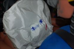 車內的情況相對比較正常,三個假人做姿端正,從慢防看氣囊打開適時,并使得假人在上面留下了比較清晰的涂料印跡。后排安全帶工作正常,約束了后排女性假人在慣性作用下前沖的趨勢。而從車內飾件上的涂料附著情況可以看出,駕駛員和副駕駛的膝部都與儀表臺或手套箱出現了輕微的接觸。  駕駛員(左)副駕駛員(中)后排乘員(右)