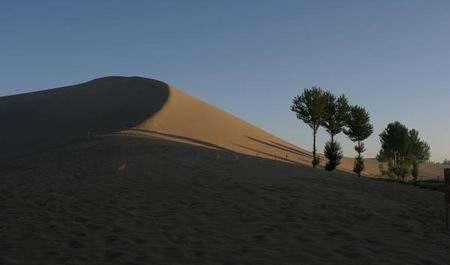 天剛蒙蒙亮,就趕往鳴沙山-月牙泉拍日出。我怎麼也沒能爬上鳴沙山的山頂,太陽早已跳到了頭頂。湛藍的天空下,晨光把沙山照耀得一片金黃,層次分明,月牙泉安靜地平躺在沙山的陰影里,一線綠色環繞著它,就象是一條翡翠項鏈,這是怎樣的一幅畫卷?