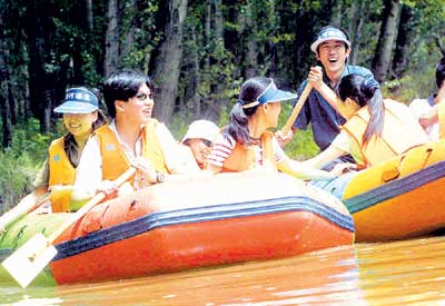 為了使漂流來得更有速度,更刺激,設置了多處水流比較激的區域,你可以乘風破浪、順水而下……接下來,船在溪水中,人也在溪水中,想要船不進水,哈哈,這是不可能的。
