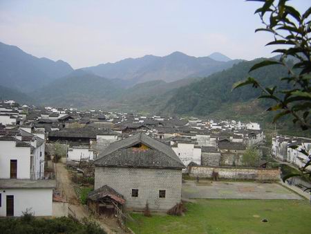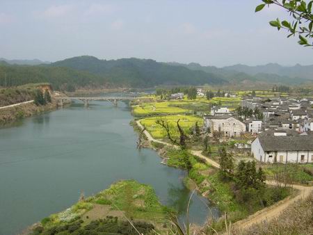 車漸行漸遠(yuǎn),離我們此行的目的地--古徽州卻越來越近。古徽州包括現(xiàn)在江西、安徽、浙江三省交界之處,大約就是現(xiàn)在的婺源、黃山、績溪等地。不知何時車開至一片空曠的田野,近處是油菜地,開滿黃色的花,很有層次;遠(yuǎn)處是不太高,但連綿不覺的山嶺,青灰青灰的,掩映在天地之間;遠(yuǎn)近之間就是那白墻灰瓦的徽派房舍了,一間一間連成排、一排一排連成片,錯落有致的布局在田野中、小河旁、遠(yuǎn)山前,一切都那么的寧靜,那么的安逸、那么的和諧。突然想起胡主席的“和諧社會”來,出生于績溪的胡主席是否也是有感于徽州的鄉(xiāng)村和諧而提出來構(gòu)建和諧社會的構(gòu)想呢?呵呵,好象想的太多了,不過倒是真的希望大家都好,這樣我們就不用這么老遠(yuǎn)來旅游了--“大家好,才是真的好”。