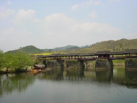 快中午時分,到達(dá)了婺源的新華鎮(zhèn),這里有中國最美的橋--彩虹橋。彩虹橋全長一百四十米,由六亭、五廊構(gòu)成長廊式人行橋,簡單稱之為廊橋(有棚頂?shù)臉?。每墩上建一個亭,墩之間的跨度部分稱為廊,因此,也叫廊亭橋。從遠(yuǎn)處看,亭略高于廊,形成錯落有致。彩虹橋前移二十多米,寬度不足六十米,可以節(jié)省大量的人力、物力、財力,卻偏要建在一百多米的河面上。我們大家知道這樣一個道理:在管道里,截面越小,水流的速度越快,反之,截面越大,水流的速度越緩。在這條河流上,汛期洪水有多大?大家注意一下第一個橋墩的尖面,它記載了八百多年的洪水情況。破水的斧面,已形成鋸齒狀。那是八百年以來,每次漲洪水,把山上木頭帶下來,撞擊橋墩形成的。橋墩破損的最高處,真實(shí)記載了歷史的最高水位,幾乎接近橋面。這么大的洪水,在不足六十米河面上建橋,無疑受到的沖力,破壞力是巨大的。建在最寬處,水流的速度會變得平緩,相對來說,是建橋的最安全處。