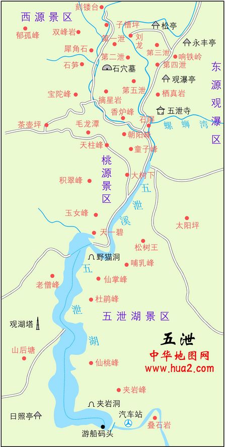 首先游覽東源景區:蛟龍出海第五泄、烈馬奔騰第四泄、珠簾風動第三泄、雙龍爭壑第二泄、月籠輕紗第一泄。再游覽西源各景點:香爐峰,啼猿谷,野生楠木林,刻鏤巖,西龍潭,一線天,三臺塔等。最后回到碼頭。