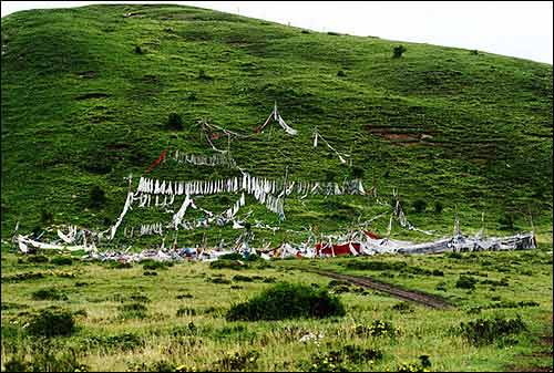 我們下榻的旅店距天葬臺約三公里左右,我們冒著雨順著山坡路緩行而上。由于下雨路爛且又滑,鞋沾滿了泥土,足有三四斤重,走一段路都要停下來喘喘氣再走。半路上遇到準備送葬的藏民,經詢間打聽得知今天會舉行天葬,我們更有了信心。越往上走,越難走。我們走走停停,一步一步向上走去,歷時一個半鐘頭,終于來到了天葬臺。此時,天葬臺仍空無一人,只有我們一塊同往的四個人,四周顯得空曠冷清。
