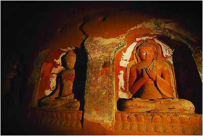 時光追溯到1600年前,即前秦建元二年(公元366年),一位叫樂僔的和尚來到甘肅敦煌境內。黃昏時刻,他無意中抬頭,只見對面三危山上光芒閃爍,頓時被山上閃動的奇異佛光所觸動。他清楚地看到三危山的金光中,顯示的不是唯我獨尊的一身佛像,而是代表過去、現在、未來三世三劫千佛的千萬身佛像……他清醒地感悟到,并非只有釋迦才是佛,而是“眾生平等,人人皆有佛性”,人人皆能成佛。順其自然,適應自然,融于自然,這便是成佛的途徑,這便是“禪”。樂僔獲此靈感,立即在身后的鳴沙山崖壁上,“架空鑿巖,造窟一龕”將自己的才情、志趣、寄托、期盼,全都融入到大漠上這個山脈之中,這便是莫高窟的緣起。此后不久,又有一位叫法良的禪師,來到樂僔的窟旁又開鑿了一個洞窟。自此之后,修造不絕,到唐時便已有一千余龕。