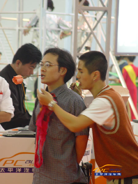 工作人員把一支玫瑰交給了那位勇敢的觀眾,要他把玫瑰咬住,只見花朵離他面部只有十來厘米的距離!接著,白衣MM掏出了一條紅絲巾把自己的眼睛緊蒙上,握了握手中的皮鞭。全場觀眾都緊閉著呼吸,靜靜的注視著MM手中的皮鞭。 只見白影一晃,MM手中的皮鞭閃電般的一劃而過,聽見皮鞭打在地面放出很大的一聲“啪”!那位勇敢觀眾嘴里咬著的那支玫瑰花已被劃過的鞭子打中,碎落的花瓣慢慢的飄散了一地。“嘩~~~”轟動的掌聲蓋過了周圍震耳的音樂,PCauto的展區成為了全場的焦點。